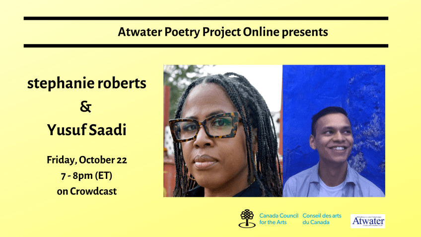 APP Online – stephanieroberts & Yusuf Saadi Published September 11, 2021 at 1920 × 1080 in news Atwater Poetry Project Online presents an evening with poet stephanie roberts and Yusuf Saadi. graphic with headshots. Like Loading...